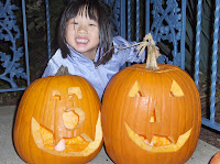 Nothing like waiting until the eleventh hour to carve pumpkins. But, we got them done tonight. I just love carving pumpkins! Leelee designed each pumpkin face. The one on her pumpkin has square eyes with little half-rounds for eyeballs - something she learned from her kindergarten teacher. When it came time for her to design the face on my pumpkin, she remembered that I like triangle eyes, so that's what I got on my pumpkin.